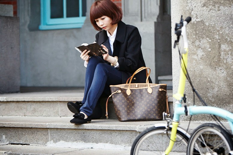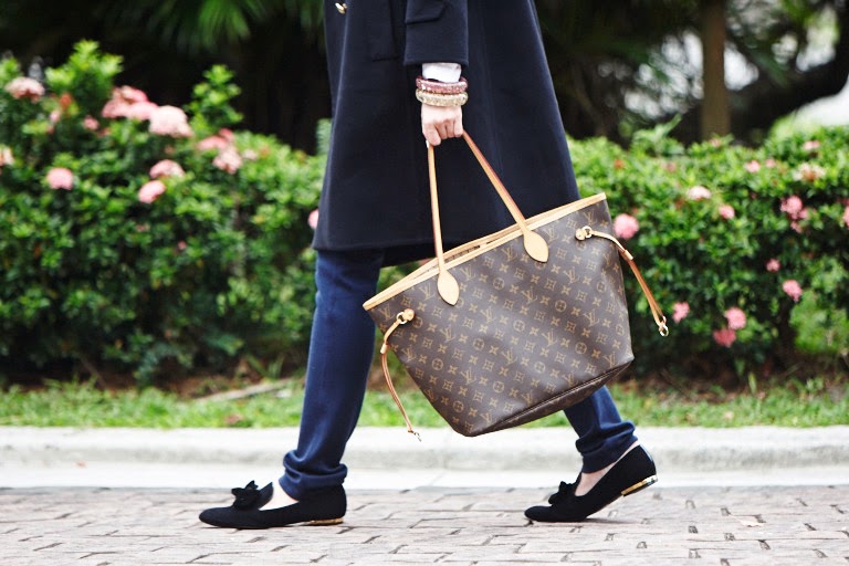 Shirt: Carven | Coat, Loafers, Bangles: Louis Vuitton | Bag: Neverfull, Louis Vuitton