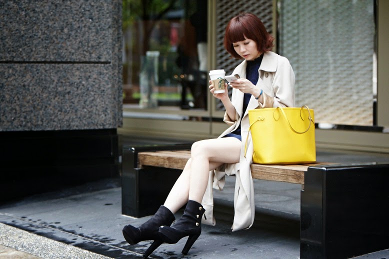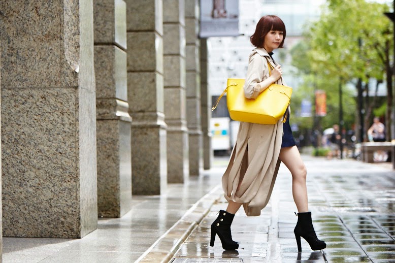 Yellow,愉悅活潑的Neverfull則代替我詮釋的這份新開始的滋味。套上我喜愛的無做作垂綴感線條風衣,迷你長度的深藍色Dress與黑色裸靴,