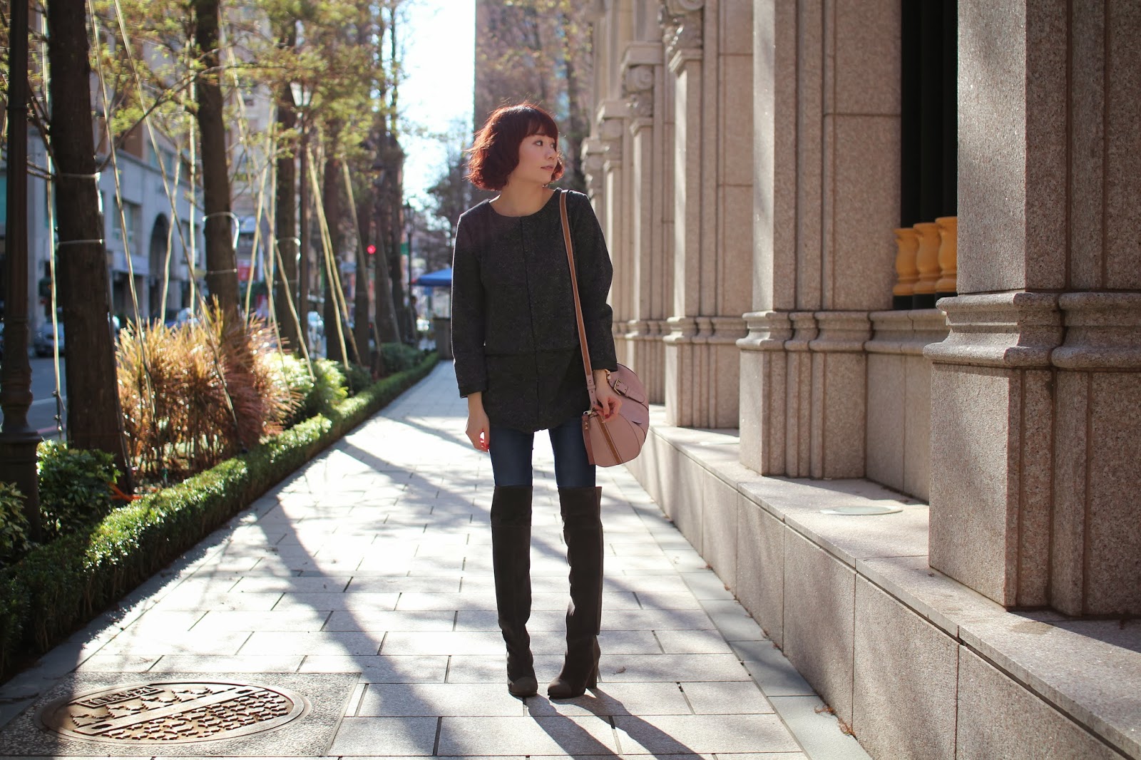 選擇毛呢混搭皮革洋裝,加上Knee High Boots與牛仔褲帥氣卻充滿性感的合身曲線,