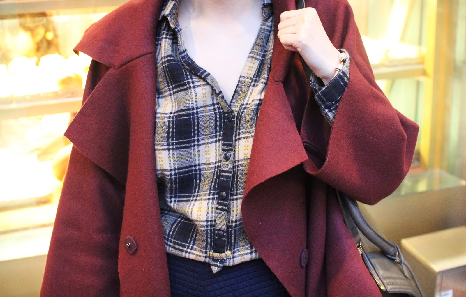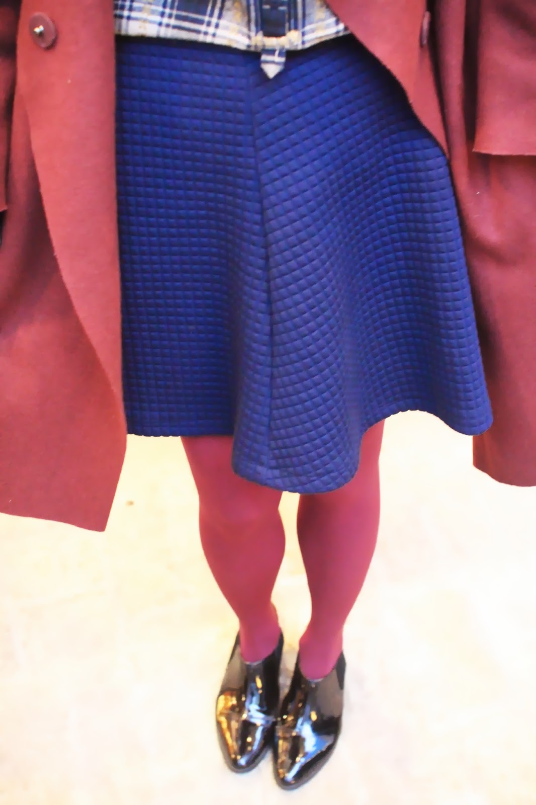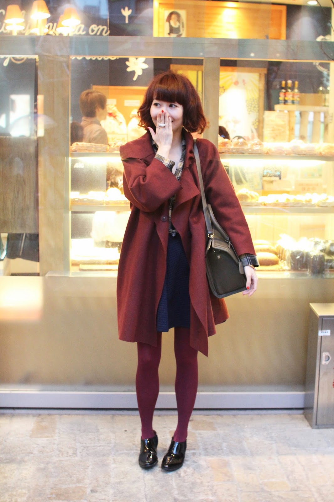 這天的穿著也特別融入的可愛的元素,鮮豔的小紅帽外套與格子襯衫,加入圓裙浪漫的搭配,還有同色系的Burgundy酒紅褲襪,