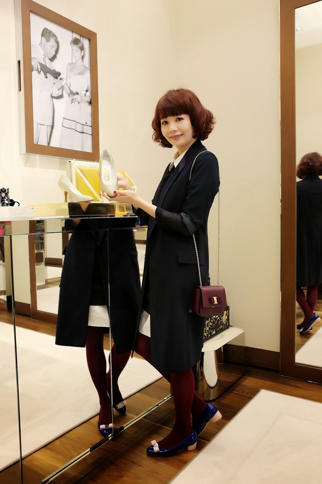 當初為了配色猶豫了非常久,最後決定選擇活潑的電光藍色作為主色,搭配優雅的淡粉羅緞蝴蝶結,就像是我個人的活潑特色感融入Ferragamo優雅的女士神韻.定製鞋款一共有兩種,平常就喜歡穿帶點高度鞋跟的我,毫不猶豫的選擇了Vara,期待這雙美鞋能帶我前往更美好的方向.這天穿著The Gallery的洋裝,優雅的襯衫領跟Ferragamo自然流露的優雅時尚品味也很相符.