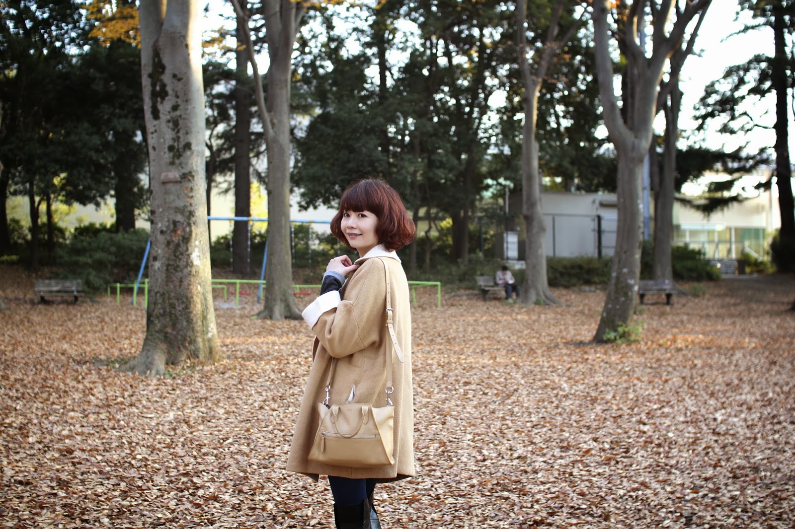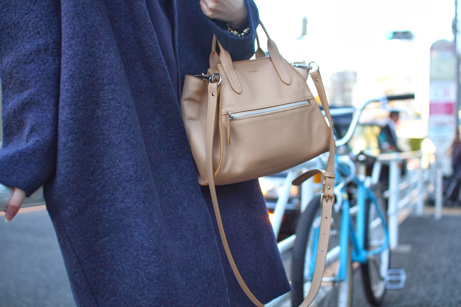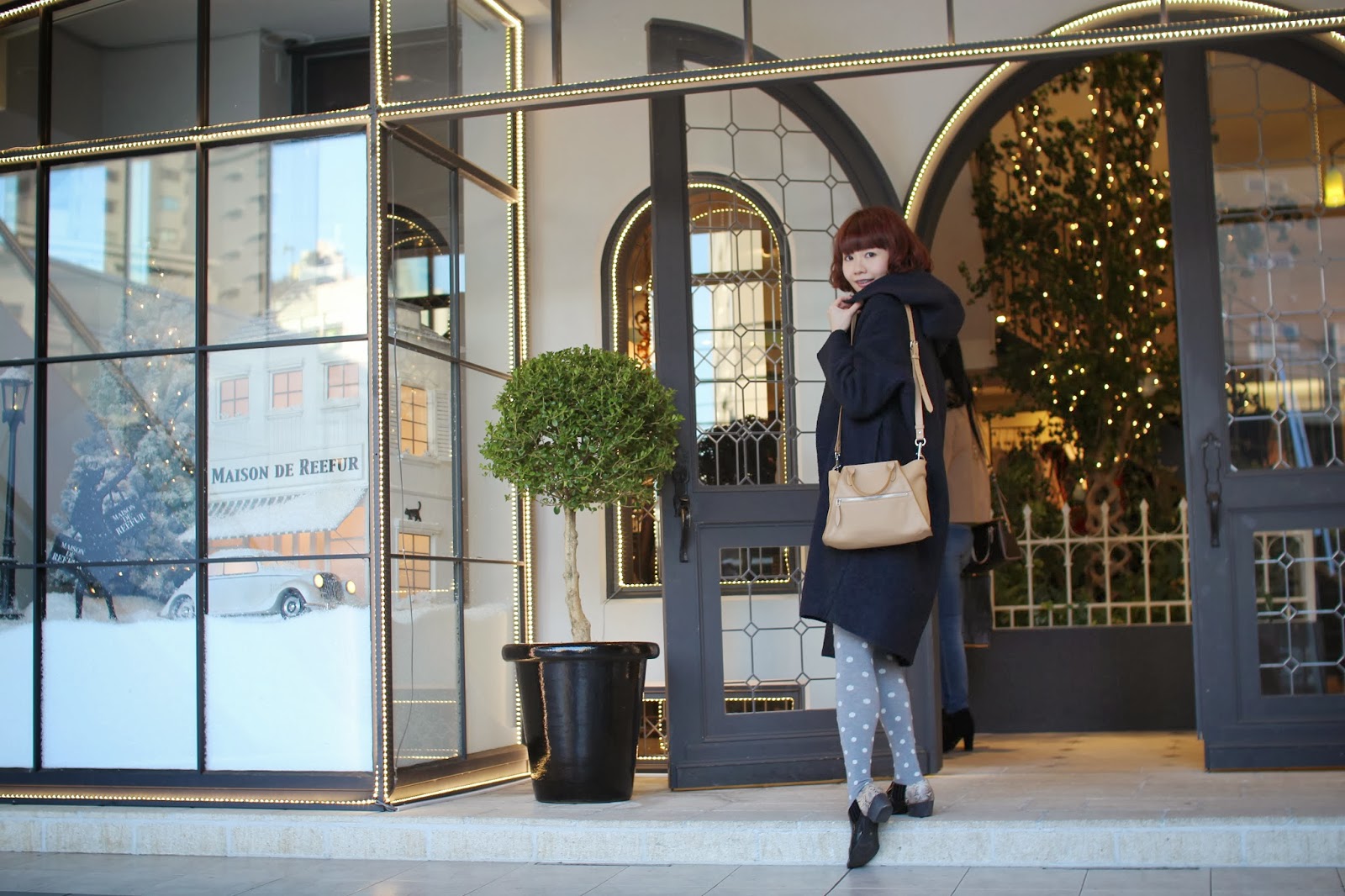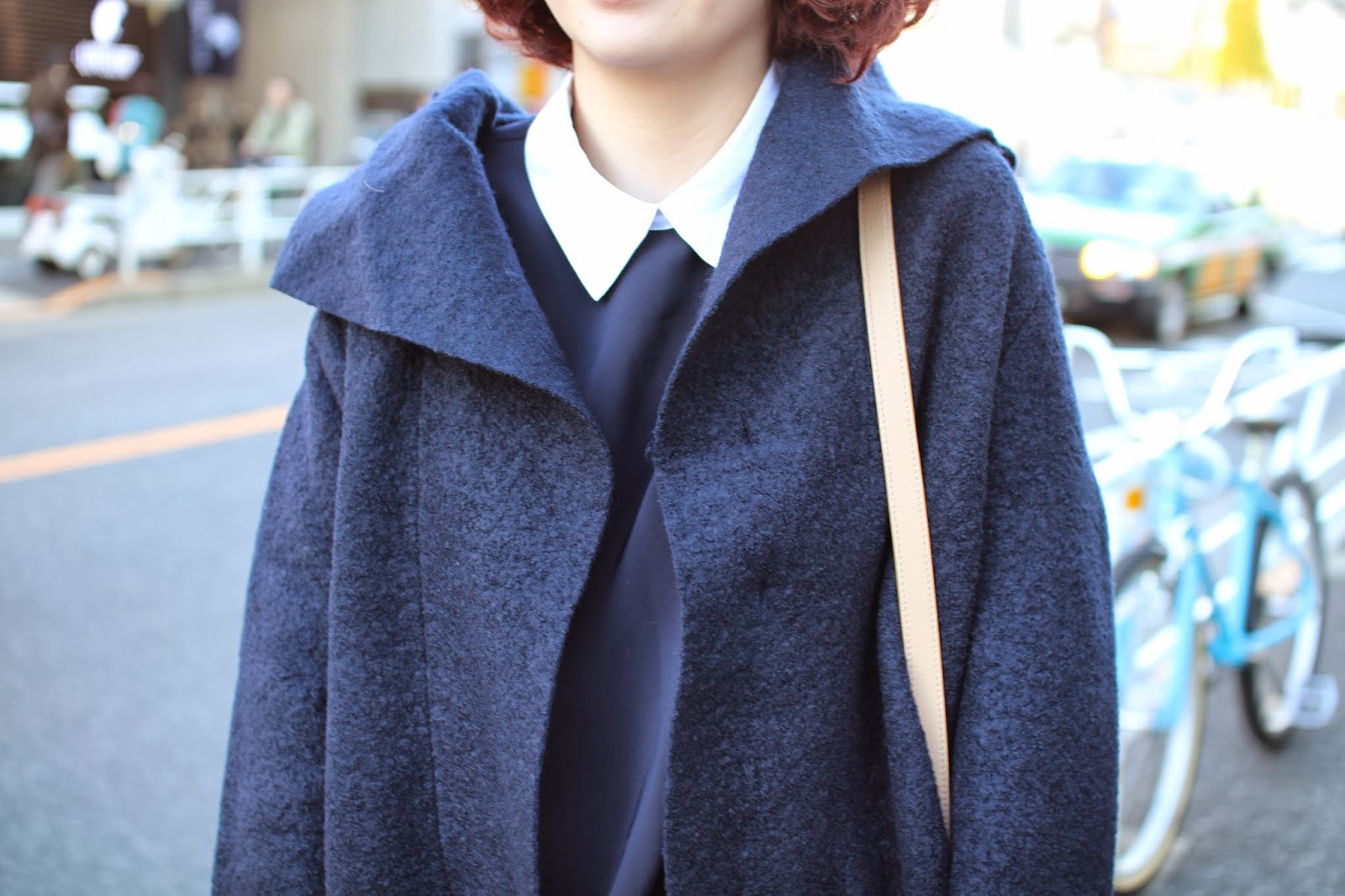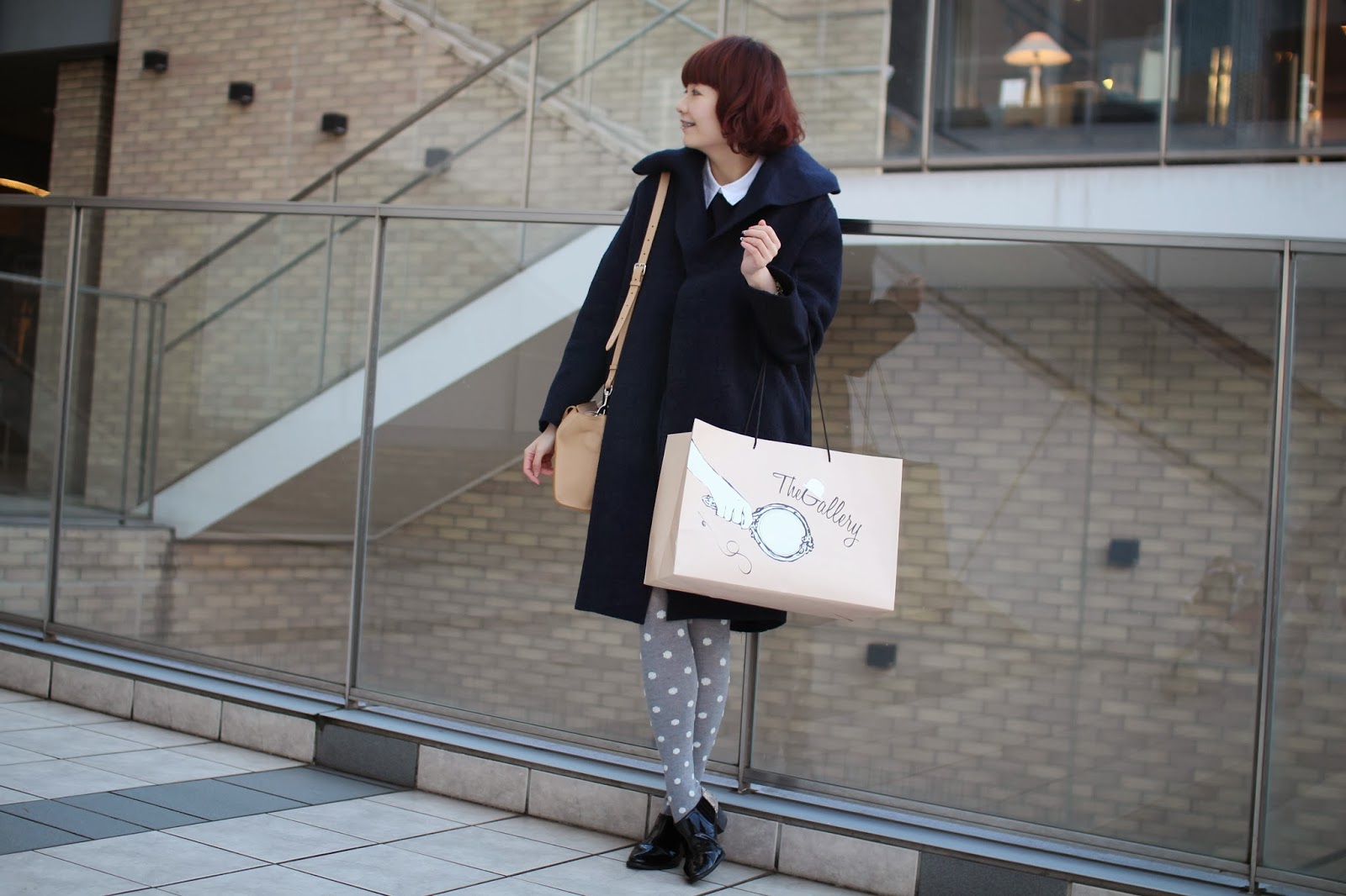 東京的冷這兩年是深刻體驗到,我要大大的這件毛呢外套滿分!讓我可以把小領洋裝穿在代官山的街頭上.整體的裝扮統一以優雅的深藍色色調,雖然是比較保守簡單的色調,大衣的不規則圈領、襯衫派的白色洋裝還有暖駝色的Rawpiece小包足以讓整體的特色凸顯出來.忘了還有俏皮的點點褲襪,T先生說這雙好像キャリーぱにゅー會穿(笑)手上的The Gallery大袋子是每回去東京必發給好友的伴手禮(笑)